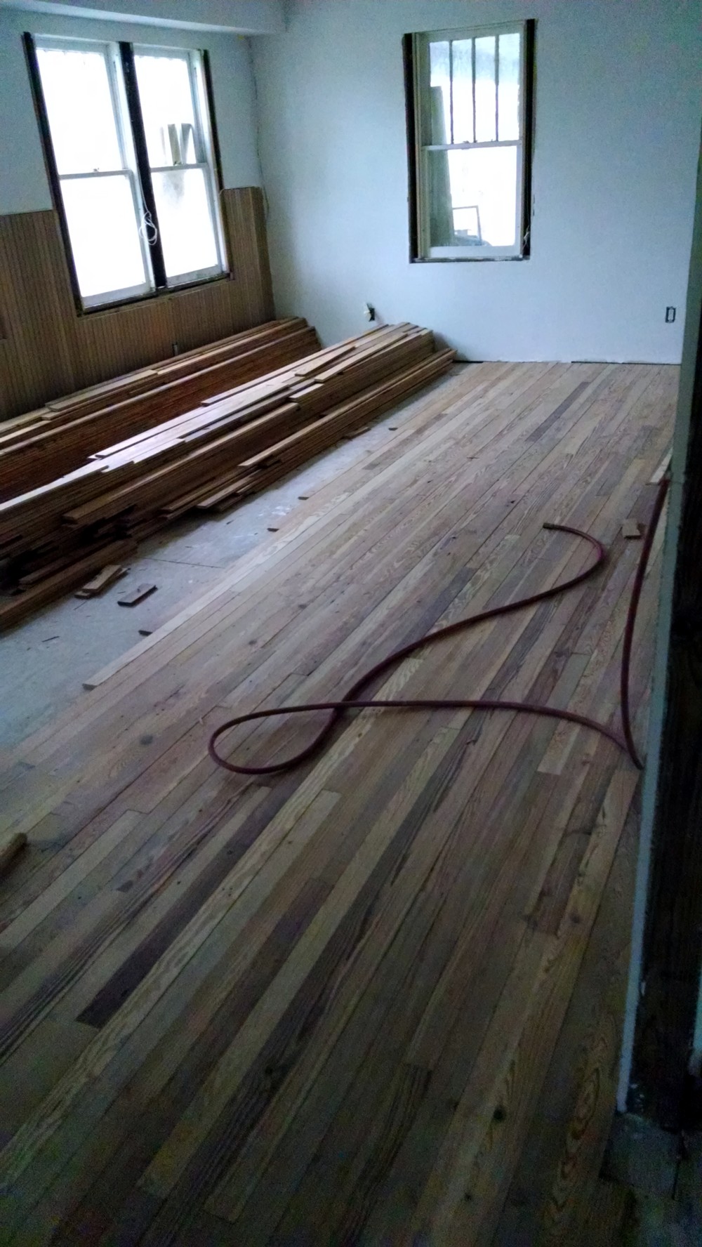 Okay, lets move downstairs, this lumber is all re-claimed Dade County Pine from the house milled into flooring. Was very difficult due to the method they used to mill it, very un-even and inconsistent but I got it all down.