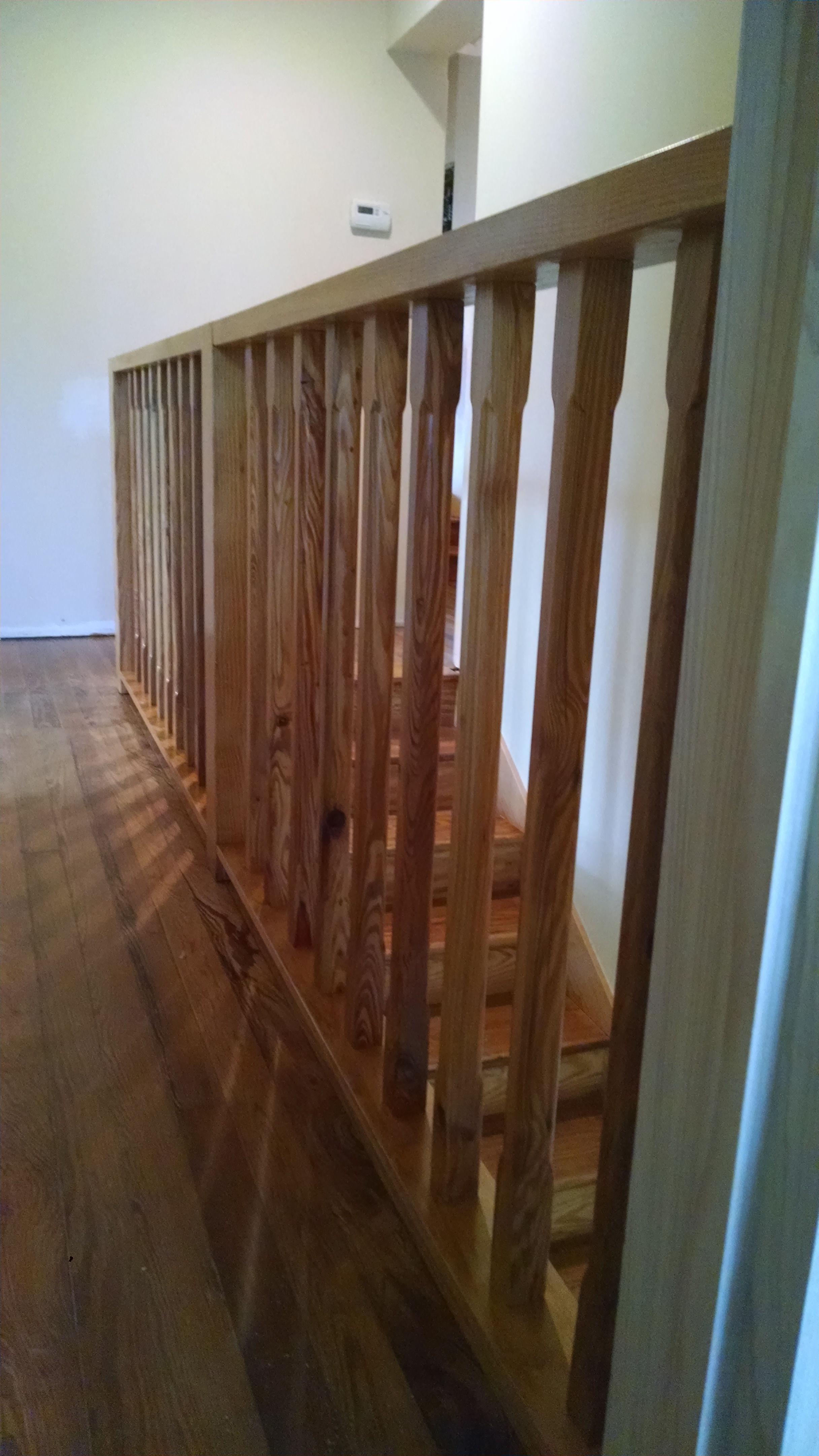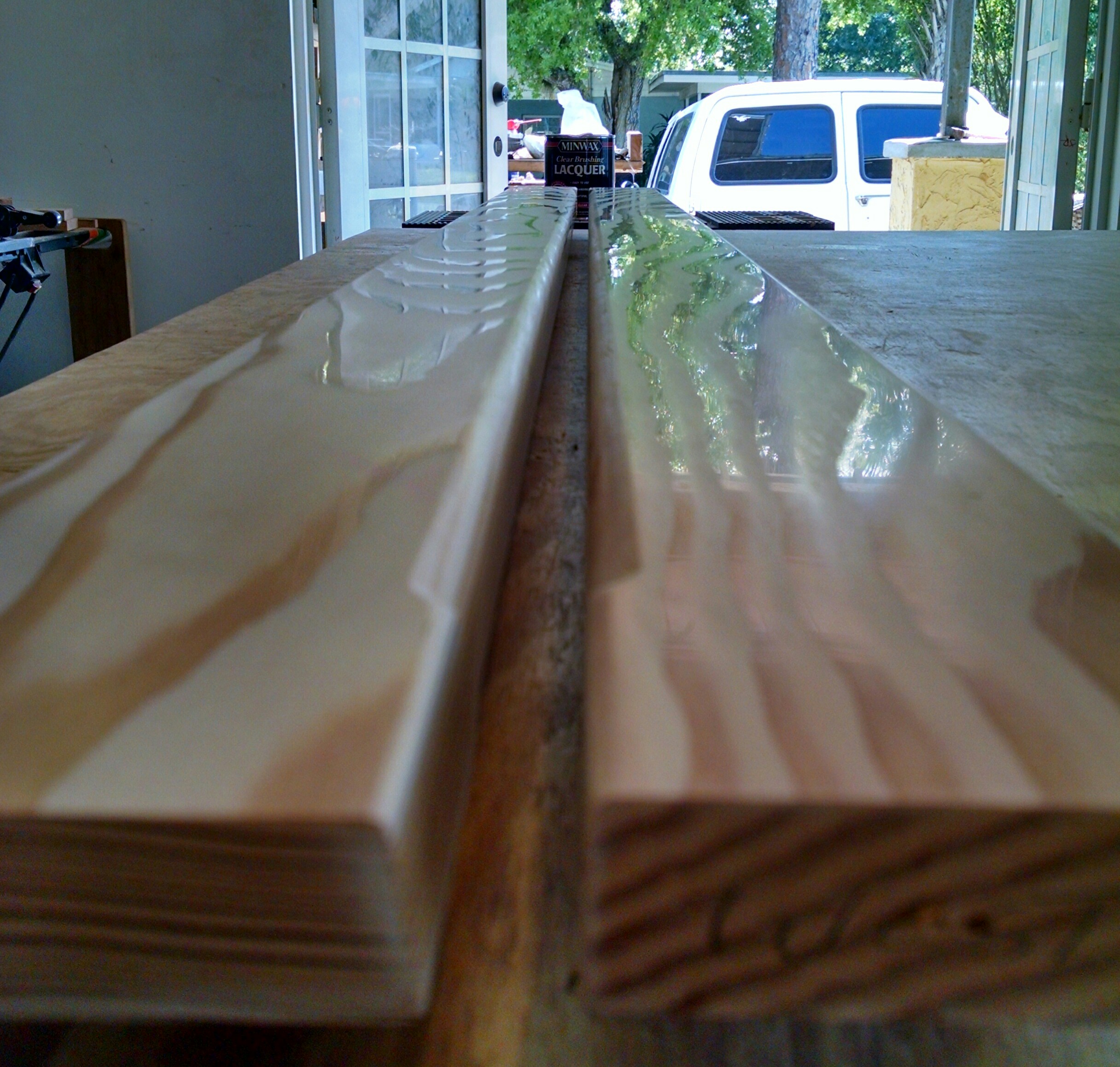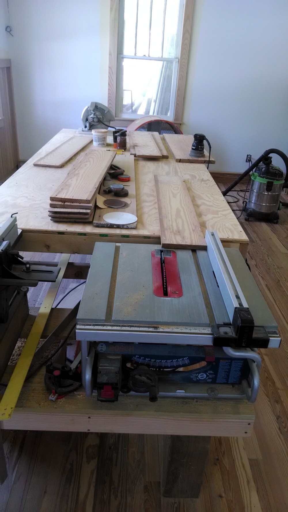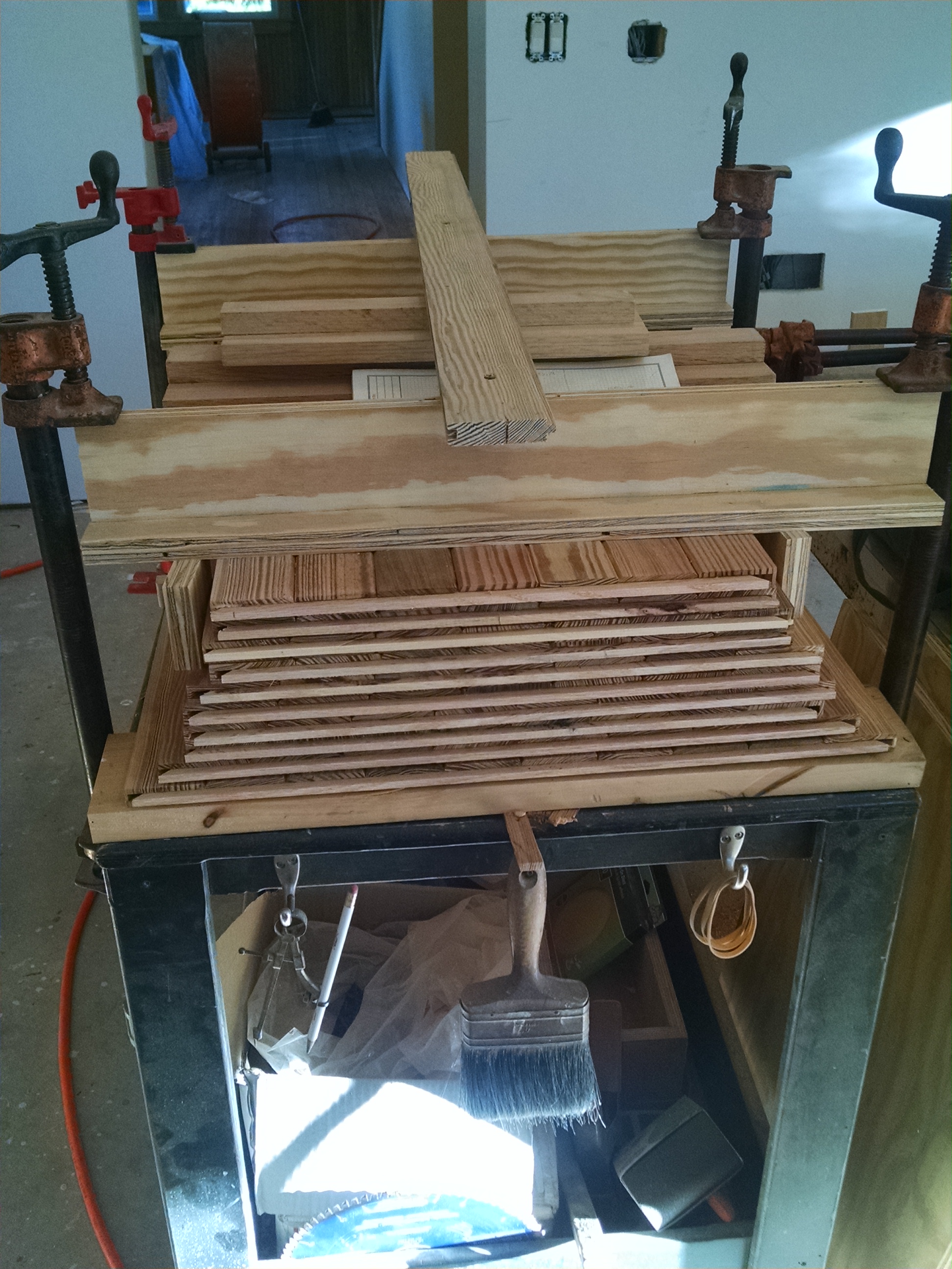 IMG_20150114_081501 IMG_20150114_081601On to handrails, wiped out another pile of twisted nail embedded Dade County Pine. Made a sled to feed into the table saw to straighten and square the boards.