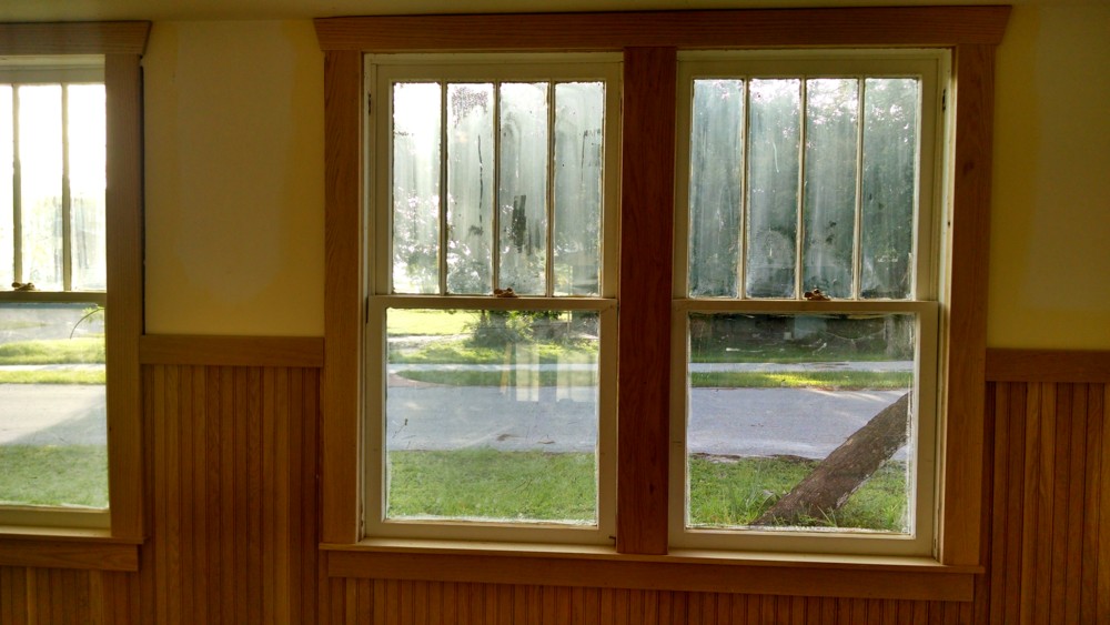 Little progress. Windows done, oak paneling cleaned of drywall mud and paint slopped all over it, can now see oak with lacquer and without for an idea what it does.